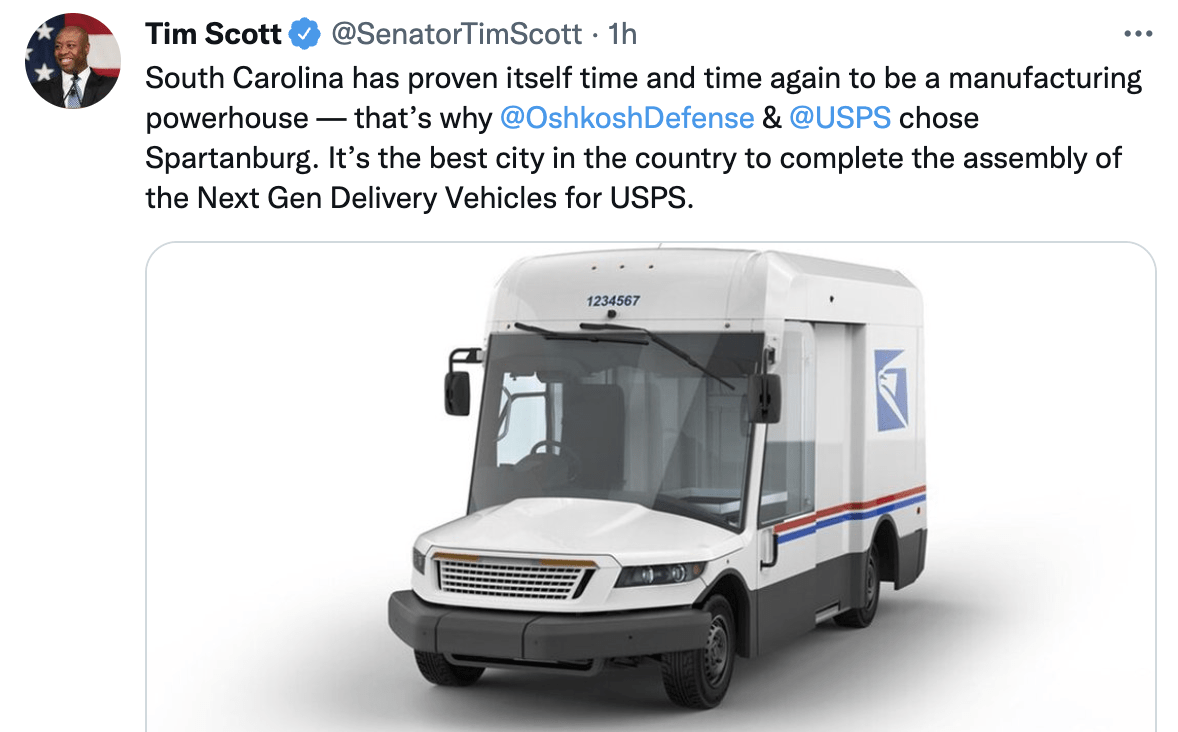 The tweet below is what got my attention after I had somewhat lost track of Oshkosh. South Carolina Senator Tim Scott used Twitter to celebrate the fact that Oshkosh Defense will build the next USPS vehicle in his home state – in Spartanburg, to be precise. Spartanburg is also home to the only BMW manufacturing facility in the US.