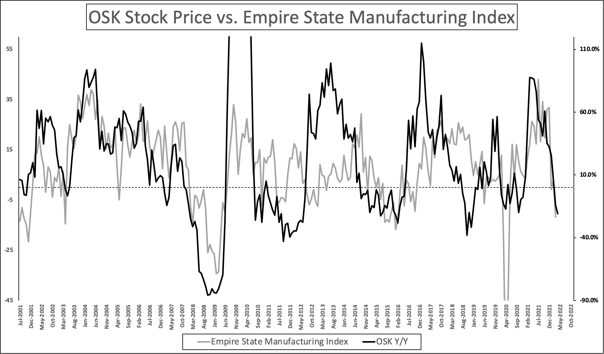 The following graph shows the year-on-year performance of the OSK stock price compared to the Empire State Manufacturing Index. This index is a survey-based, forward-looking economic indicator comparable to the ISM index. What we’re seeing here is an almost “perfect” correlation – at least when it comes to the bigger picture.