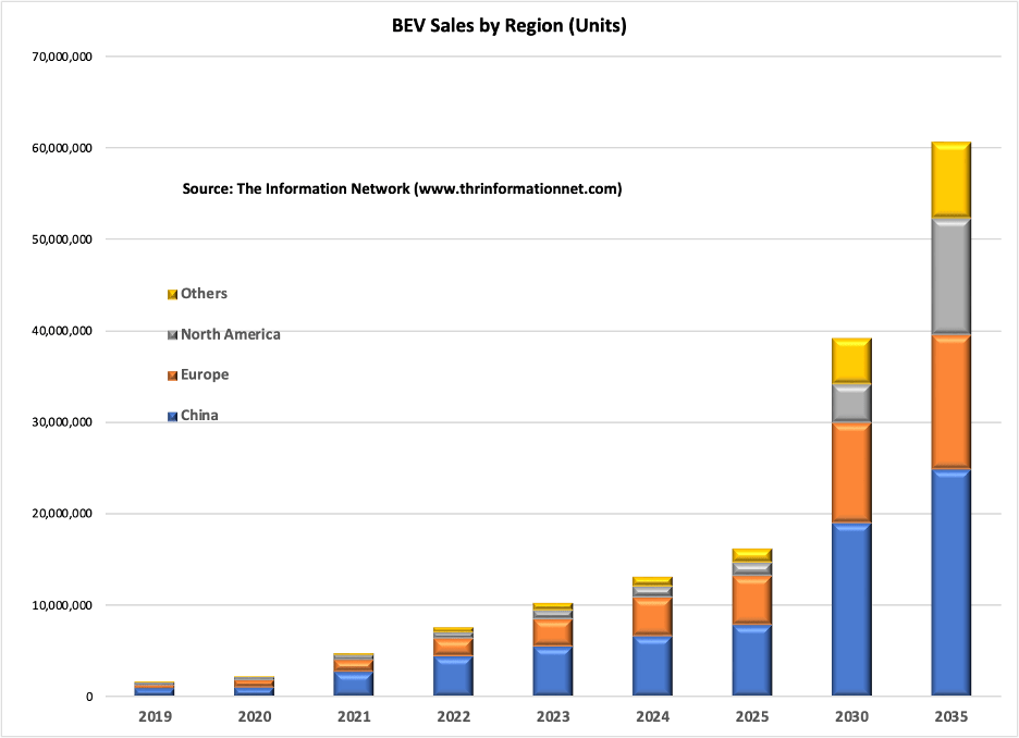 Looking forward to 2030 and beyond, Chart 1 forecasts BEV sales by region, according to The Information Network’s report entitled “Global and China EV Batteries and Materials: Technology, Trends and Market Forecasts.”