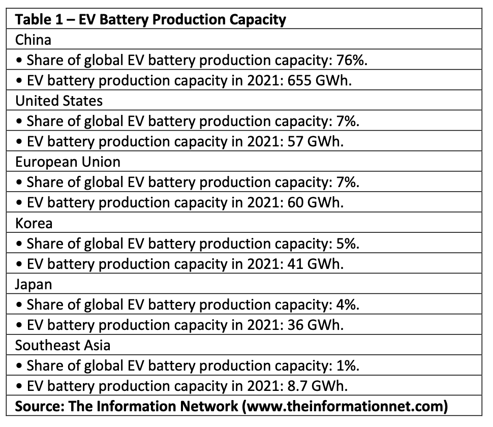 China dominates production at every stage of the EV battery supply chain downstream of mining, as 76% of battery cell production capacity is in China, as shown in Table 1. The United States has a smaller role in the global EV battery supply chain, with only 10% of EV production and 7% of battery production capacity.