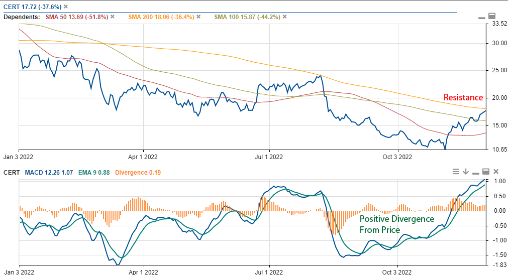 CERT stock adjusted for the strong quarterly results by erasing around half of the stock’s losses since August. Per the chart below, the stock’s moving average convergence divergence slope diverged from the falling stock price before the Q3 report. After rallying from the $10.65 low, could face resistance at the 200-day simple moving average. That suggests the rally may lose momentum near current prices.