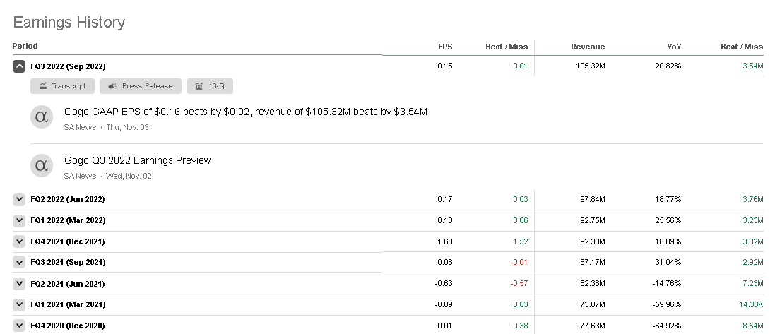 There’s an emerging bounce-higher momentum for GOGO after its excellent Q3 performance. The +10.14% 1-month rally for GOGO is largely thanks to its Q3 GAAP EPS of $0.16 (beats by $0.02) and Q3 revenue of $105.32 million (beats by $3.54 million and is +20.82% Y/Y). Gogo has beaten quarterly revenue estimates for the past eight quarters.