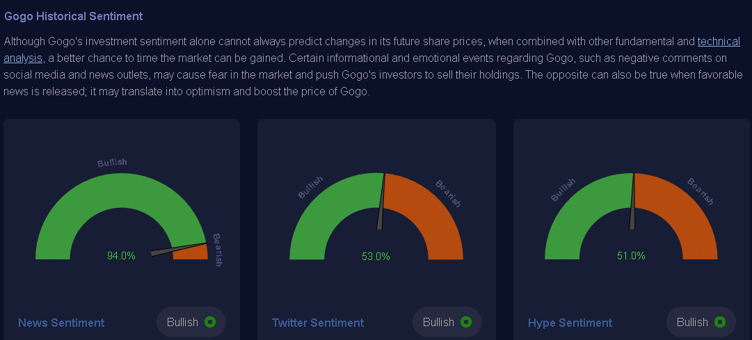 The internet and social media are now also important barometers to gauge the general public’s perception of a particular stock. The sentiment analysis result is also bullish for GOGO. There’s no recent news or information leak that could derail GOGO’s upward momentum.