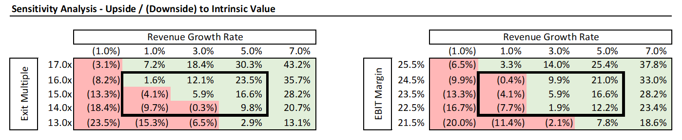To get a sense of the company’s intrinsic value, I ran a DCF analysis. No DCF analysis can provide a perfect picture of future returns for shareholders; however, they can provide an illustrative “story” of the likelihood of different scenarios. In my DCF analysis, I assumed 5% revenue growth after a contracting somewhat in 2021. I also assumed EBIT margins expanding gradually by around just 200 bps heading towards 2025. Capex, increases in net working capital, depreciation, and taxes were flat-lined for simplicity.