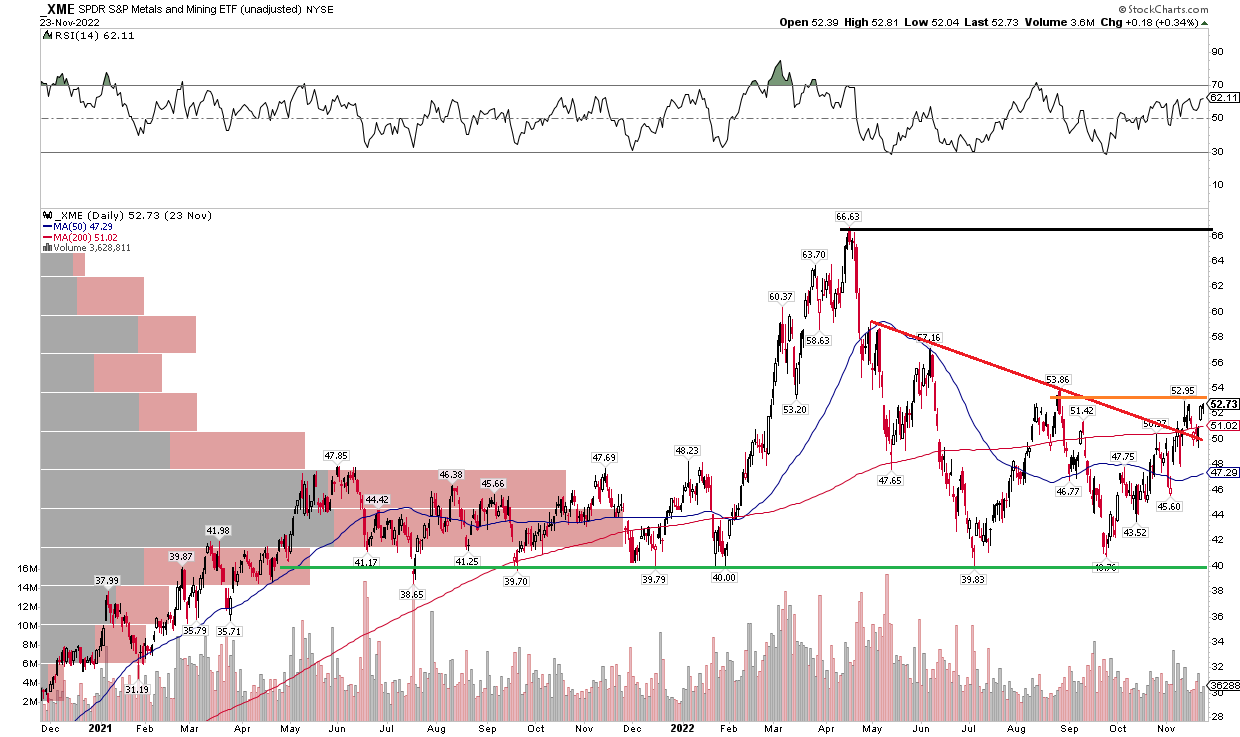 While the relative chart of XME against SPY looks good with a steady uptrend during the second half of 2022, the absolute chart is also constructive. Notice that the fund recently broke out from a downtrend dating back to May. On several occasions, XME held the pivotal $39 to $41 zone – that is a key spot for the bulls to monitor.