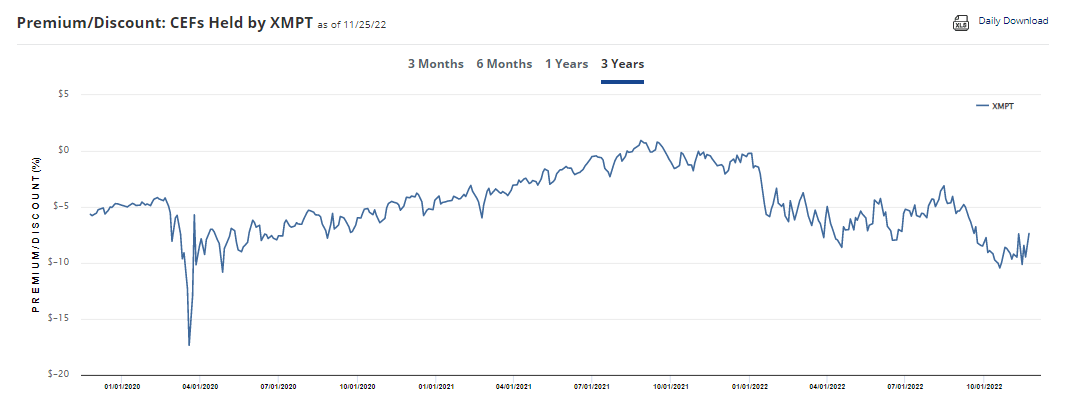 XMPT is a rather interesting ETF that invests in municipal closed-end funds. As an ETF, it is passively managed based on a reconstitute semi-annually and quarterly rebalancing. However, the underlying holdings are actively managed funds. They are making changes much more frequently. The underlying CEFs can also trade at large discounts, presenting a fairly strong opportunity as they are trading at wider than usual discounts.