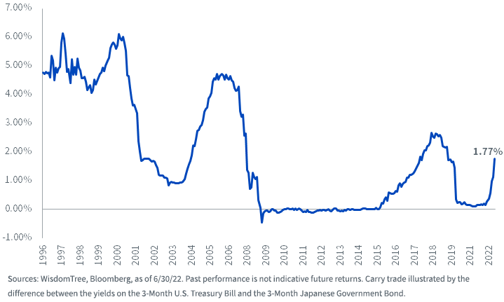 This isn’t unprecedented, however, considering the headwinds driving the yen lower versus the greenback. The U.S., much like the rest of the global economy, is wrestling with the highest inflation in four decades, rapidly forcing the Federal Reserve into monetary tightening. Speculation about where the rate hike cycle may ultimately conclude over the next 12-24 months is driving the USD higher. Despite some of the highest readings in inflation in the last decade, the Bank of Japan (BoJ) has remained committed to its accommodative policies of negative short-term interest rates and yield curve control. As a result of ever-widening interest rate differentials between the U.S. and Japan, the JPY has weakened dramatically.