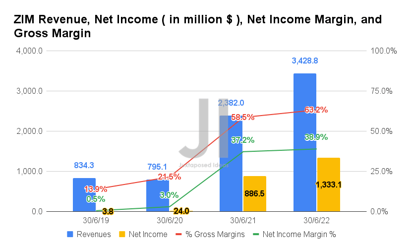 In FQ2’22, ZIM reported revenues of $3.42B and gross margins of 63.2%, representing an excellent increase of 43.69% and 4.7 percentage points YoY, respectively. This has directly contributed to the growth in its profitability, with net incomes of $1.33B and net income margins of 38.9% in the latest quarter. It indicates a tremendous increase of 51.13% and 1.7 percentage points YoY, respectively.