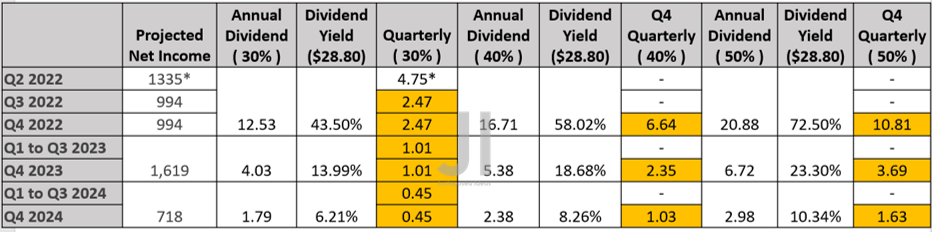In the meantime, for FY2023’s projected net incomes of $1.61B, we will naturally see a much lower dividend payout of $1.01 for the first three quarters with up to $3.69 by FQ4’23. This indicates an excellent dividend yield of 23.3% then. For FY2024, we may see $0.45 every quarterly with up to $1.63 for FQ4’24, triggering a decent 10.34% yield then.