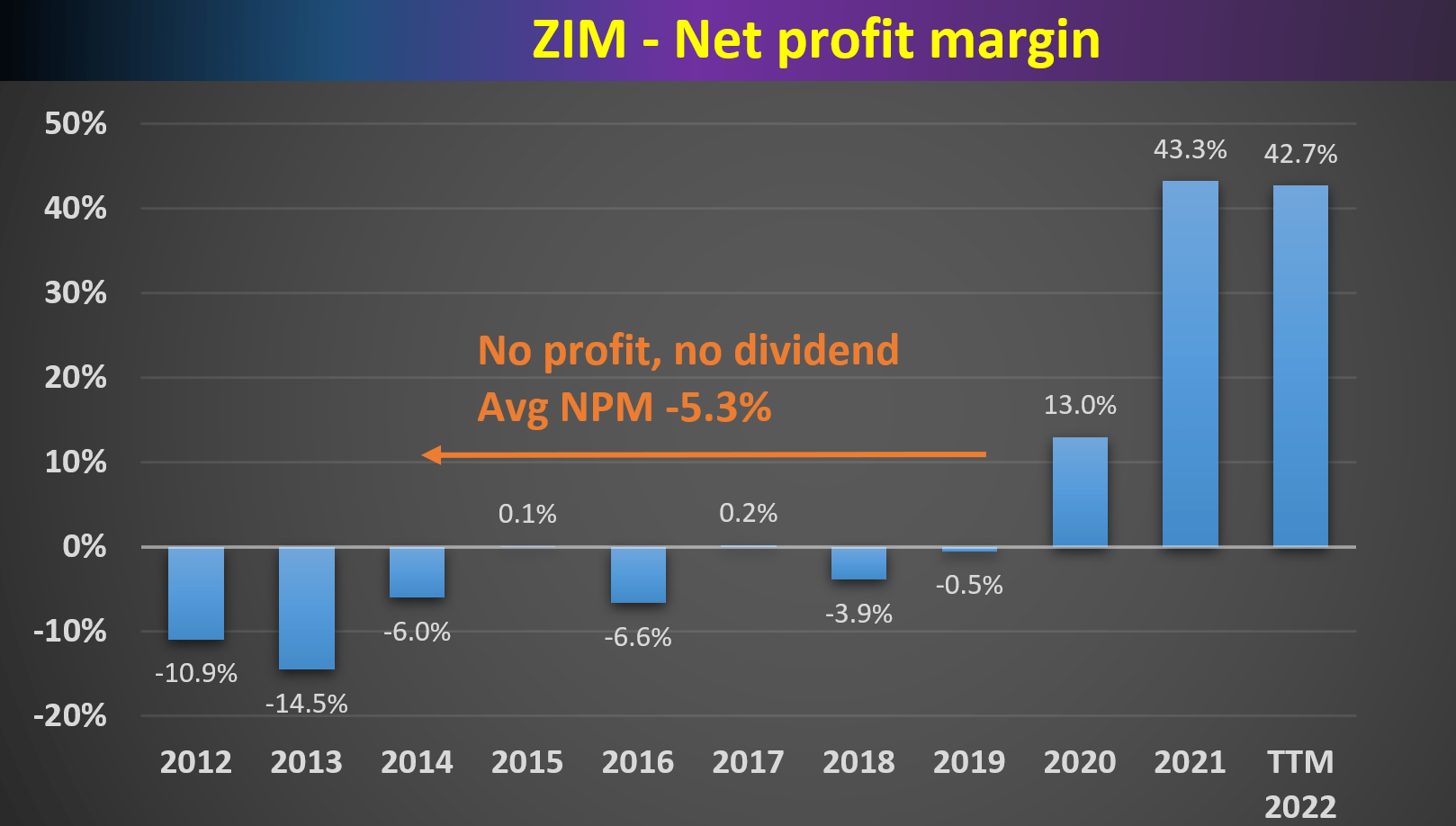 Let’s start with a historical perspective first. The next plot shows ZIM’s net profit margin (“NPM”) in the past decade on an annual basis. As you can see, the business had no net profit on average between 2012 and 2019. As a matter of fact, its average net profit margin is negative – 5.3% during those years. And of course, as a result, it was unable to pay any dividends during those years.