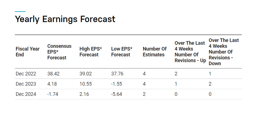 Based on profits expected in 2022, ZIM Integrated Shipping has a P/E ratio of 0.4x (really!). The P/E ratio for 2023 is 5.3x, as the market anticipates a recession in the global container shipping industry. The 5.3x P/E ratio assumes earnings of $4.18 in 2023 (see chart below).