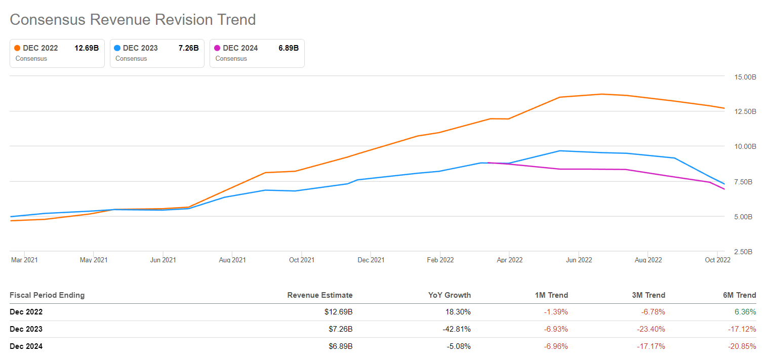 ZIM Integrated Shipping’s revenue estimates have also started to drop as more analysts see the writing on the wall and react to collapsing shipping rates. ZIM Integrated Shipping’s revenues are expected to decline 43% in FY 2023.