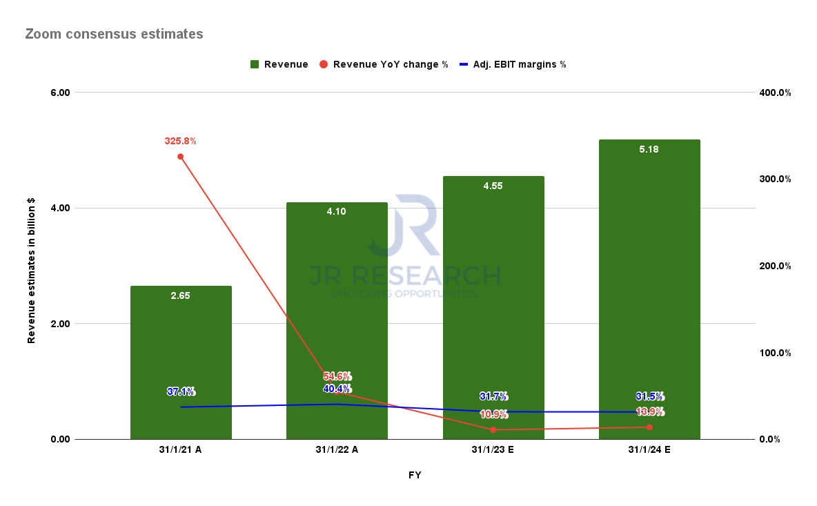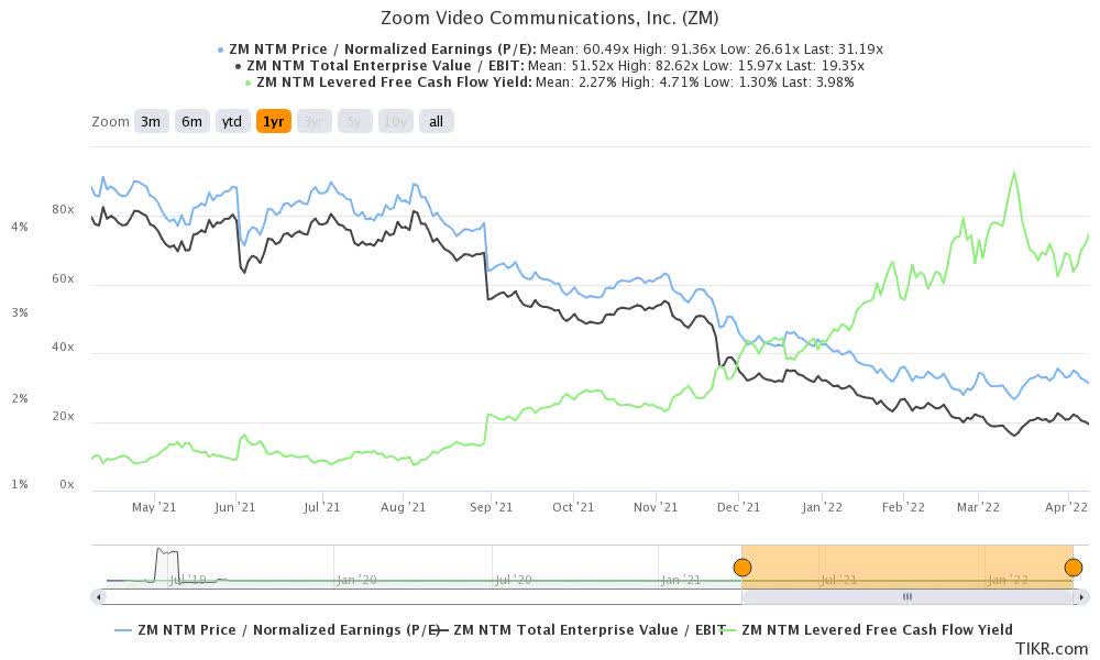 However, consensus estimates suggest that Zoom’s adjusted EPS would fall by 29.9% in FY23 before reversing in FY24. Therefore, we don’t think ZM stock looks significantly undervalued despite the compression.